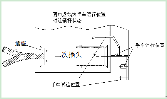 只有当手车处于试验位置时才能插拔二次插头。手车离开断开位置/试验位置后,在向工作位置推进的过程中和达到工作位置以后,不能拔开二次插头。如图。