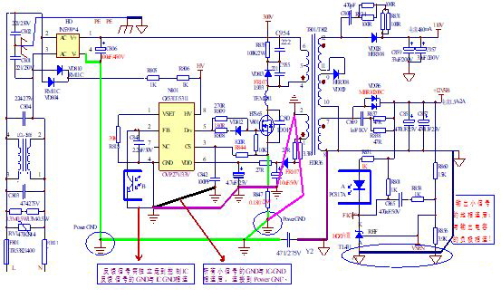 A.连接方法为所有小信号GND与控制IC的GND相连后,与辅助绕组的输出电容地相连,然后与辅助绕组的地相连,再连接到Power GND(即大信号GND);