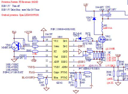 采样电阻R=R923//R922//R941//R942;该电阻的作用是检测输出电流,当输出电流超过阀值时,将控制输出PWM脉冲宽度进行调整,保持输出电流恒定。IC-7Pin & 8Pin通过外部的PWM(150HZ-300HZ)来进行PWM调光控制;IC-14Pin-RT为内部震荡电路的频率调整电阻,电阻变小,则频率升高,一般情况,输出方波频率等于该震荡频率。频率越高输出纹波越小。